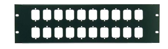 3U 19" rack mounting panel that will accept 20 male or female IEC connectors, our code F29, F30. Finished in black.
