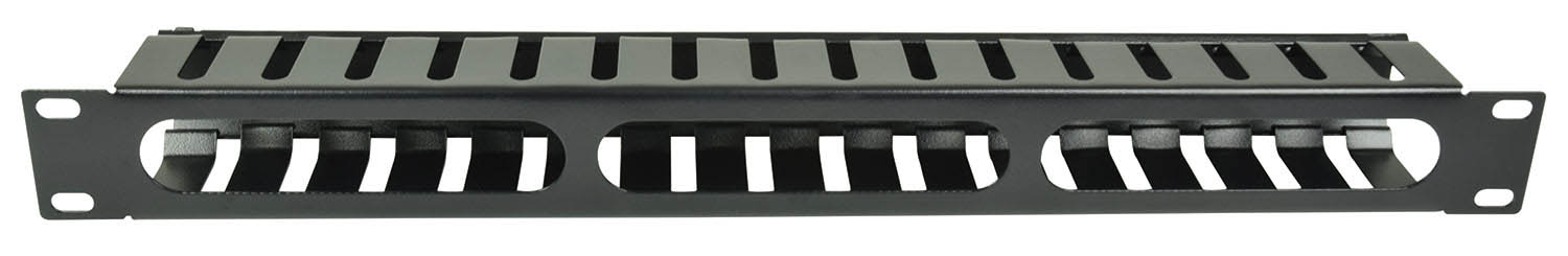 1U blank plate with rear-mounted finger trunking and clip on back plate. Designed to provide a flexible and tidy solution where numerous signal patch cables are running within a 19" rack installation.