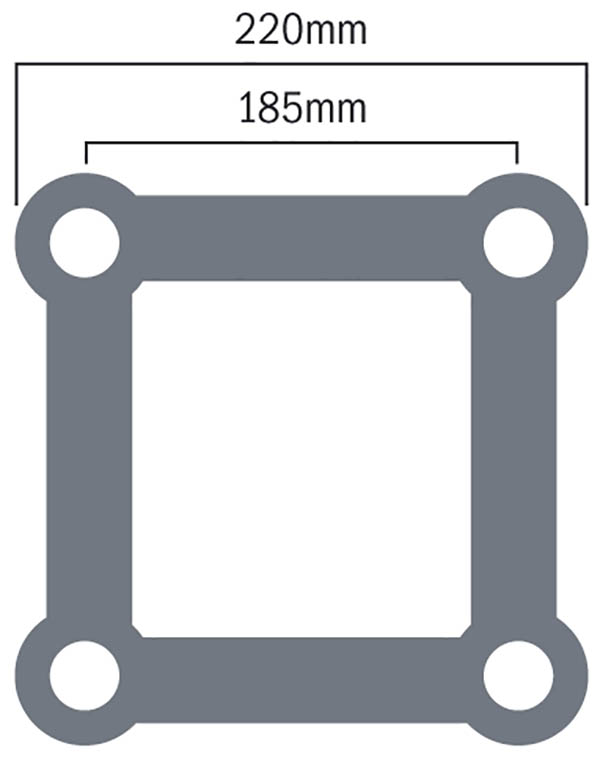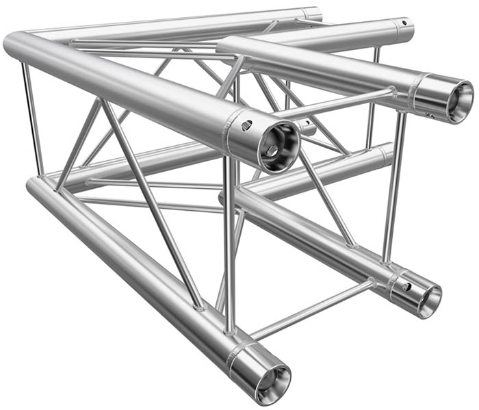 The F24 series from Global Truss has a 220mm footprint and 35mm tube and is ideal for shop fitting, bars, restaurants, trade fairs and exhibitions. A full range of accessories are also available for this series. This is a 90 degree 2 way corner piece and measures 0.5m in 2 directions. Supplied with 4 conicals, 8 pins and 8 clips.