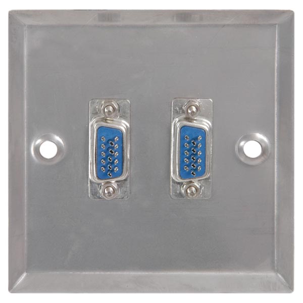 Flush mount steel wall plate with 2 x 15 pin VGA female connections for devices such as monitors and projectors. Fits a standard mains back box Solder terminal connections. Fixing screws supplied