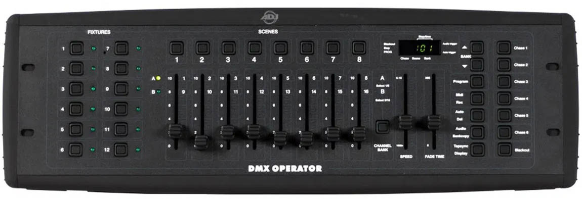 ADJ's DMX Operator Controller has 12 individual fixture buttons which allow you to control up to 12 separate intelligent lighting fixtures of up to 16 DMX channels each. With ADJ's DMX Operator Controller, you can record up to 6 chases with separate fade times and step speeds. The 8 individual channel faders provided you with easy controllability of any DMX512 moving light.
