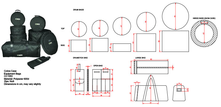 Dimensions: Bass Drum: 660 Diameter x 460mmFloor Tom: 460 Diameter x 425mmSnare Drum: 420 Diameter x 185mmLarge Tom Tom: 370 Diameter x 290mmSmall Tom Tom: 355 Diameter x 255mmCymbal: Compartment 1: 565mm DiameterCompartment 2: 430mm DiameterStick: 415 x 170 x 30mmHardware Bag: 310 x 310 x 830mmOverall Weight: 4.4Kg