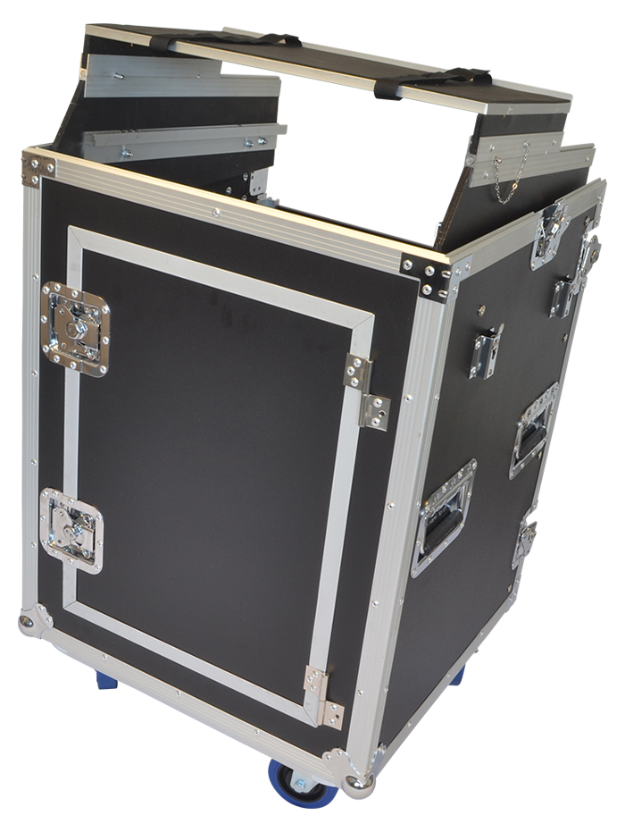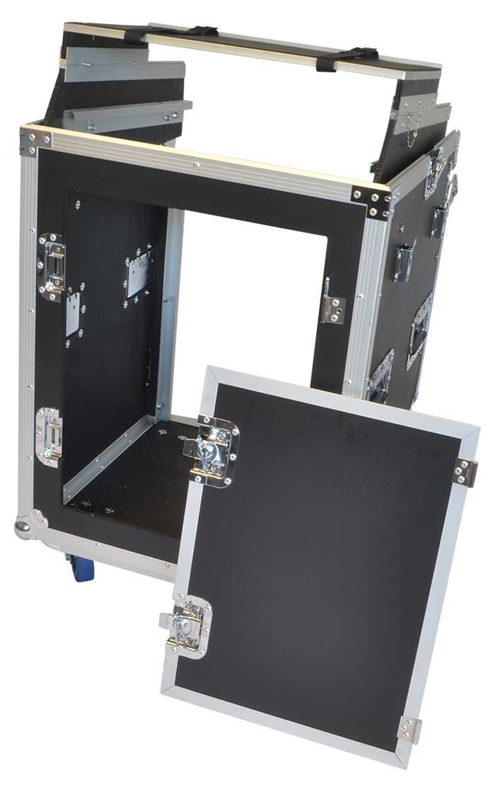 A rack case with removable front, top, hinged removable back door and sliding laptop shelf. The front face has room for 12U of equipment, the mixer section 10U. Both sections are supplied with plenty of cage nuts and fixings. The laptop shelf can slide and be secured with pins, there is also a strap to secure a laptop during transportation. One of the Covering doors and also be attached as a side table with folding legs.This is a strong well constructed very versatile case with metal fittings and handles. The case is supplied with 4 robust wheels that can be fitted if required.