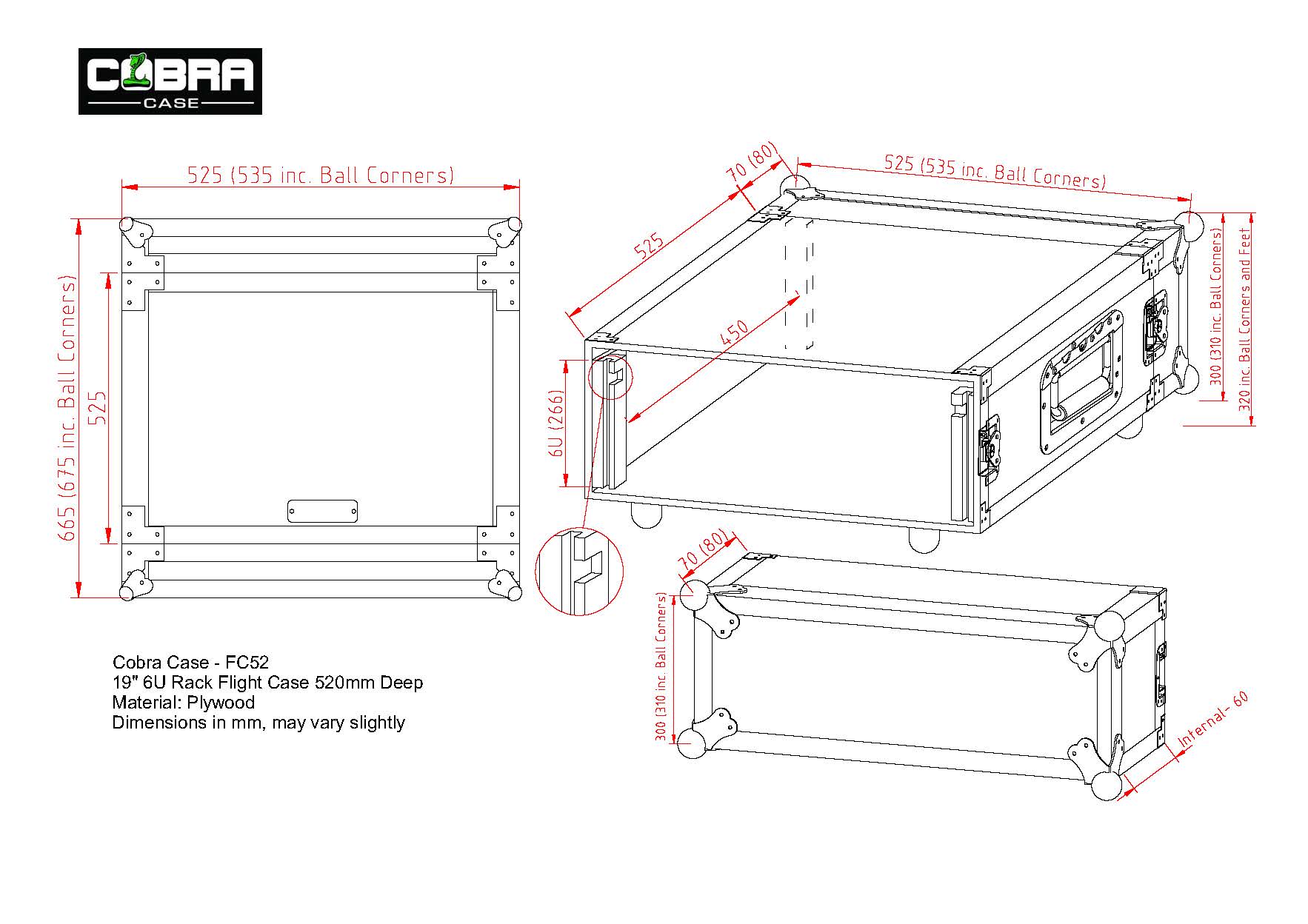 Tough flight case made from laminated ply with full aluminium trim. Butterfly catches are fitted on all lids. Both front and back covers are removable and rack mounting strips are ready fitted and mounted front and back. Nominal equipment depth is 520mm, but front and back panel controls and connectors can protrude into the lids, so equipment can be 570mm in overall depth.