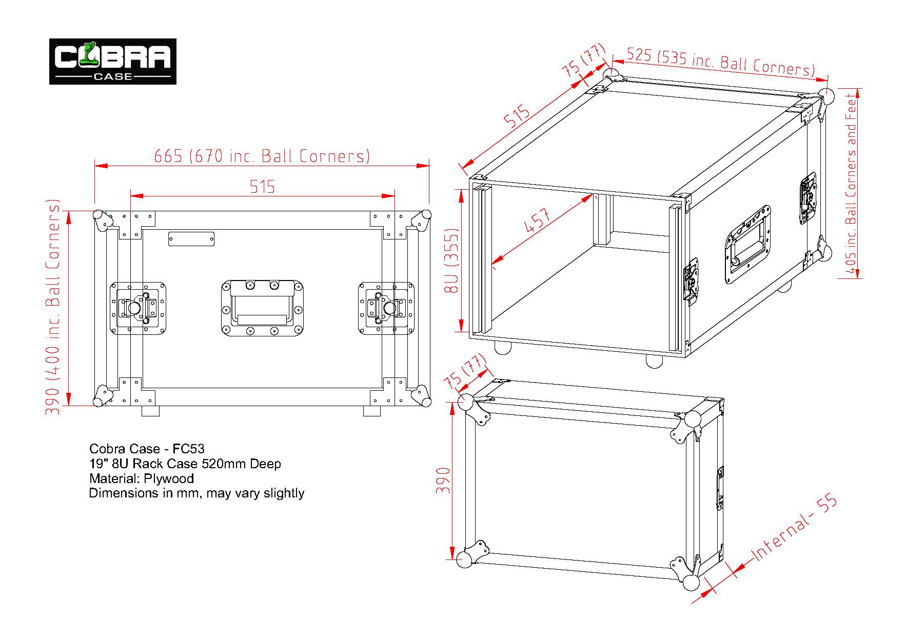 Both front and back covers on this 8U rack case are removable and rack mounting strips are ready fitted and mounted front and back. Nominal equipment depth is 520mm, but front and back panel controls and connectors can protrude into the lids, so equipment can be 570mm in overall depth.
