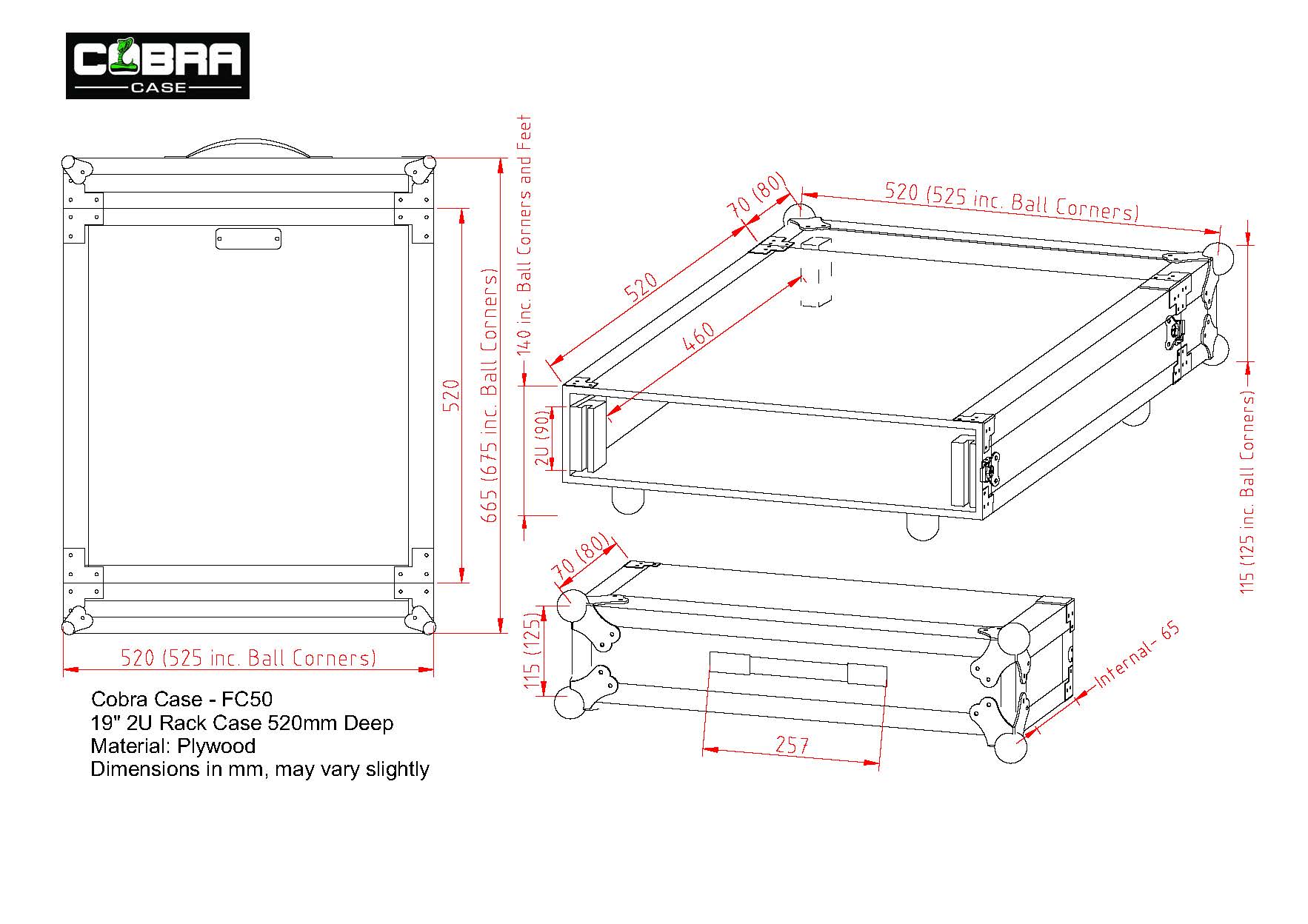 Tough flight case made from laminated ply with full aluminium trim. Butterfly catches are fitted on all lids. Both front and back covers are removable and rack mounting strips are ready fitted and mounted front and back. Nominal equipment depth is 520mm, but front and back panel controls and connectors can protrude into the lids, so equipment can be 570mm in overall depth.