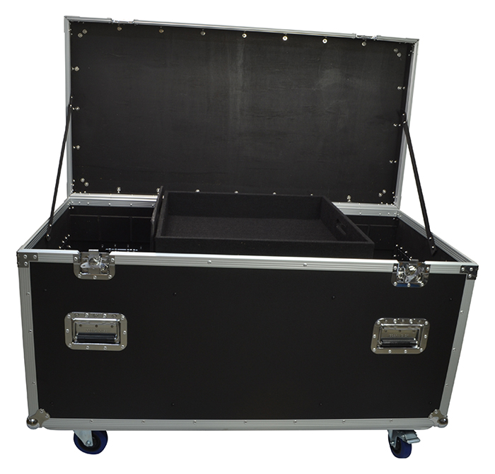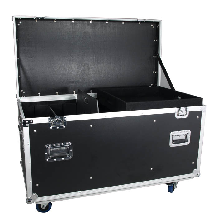 This flight case on wheels is made from 10mm hardwood, which is covered with a tough black laminate. The edges are strengthened using aluminium trim and secured in place with strong rivets. Each side has two counter sunk extra heavy duty handles for lifting under load. The lid is permanently hinged ensuring it cannot be lost or misplaced with two metal robust catches for security and safety. Heavy-duty ball corners are fitted all round and the case underside has further wood reinforcing. Four 5 inch casters are supplied and can easily be screwed in place on the base.