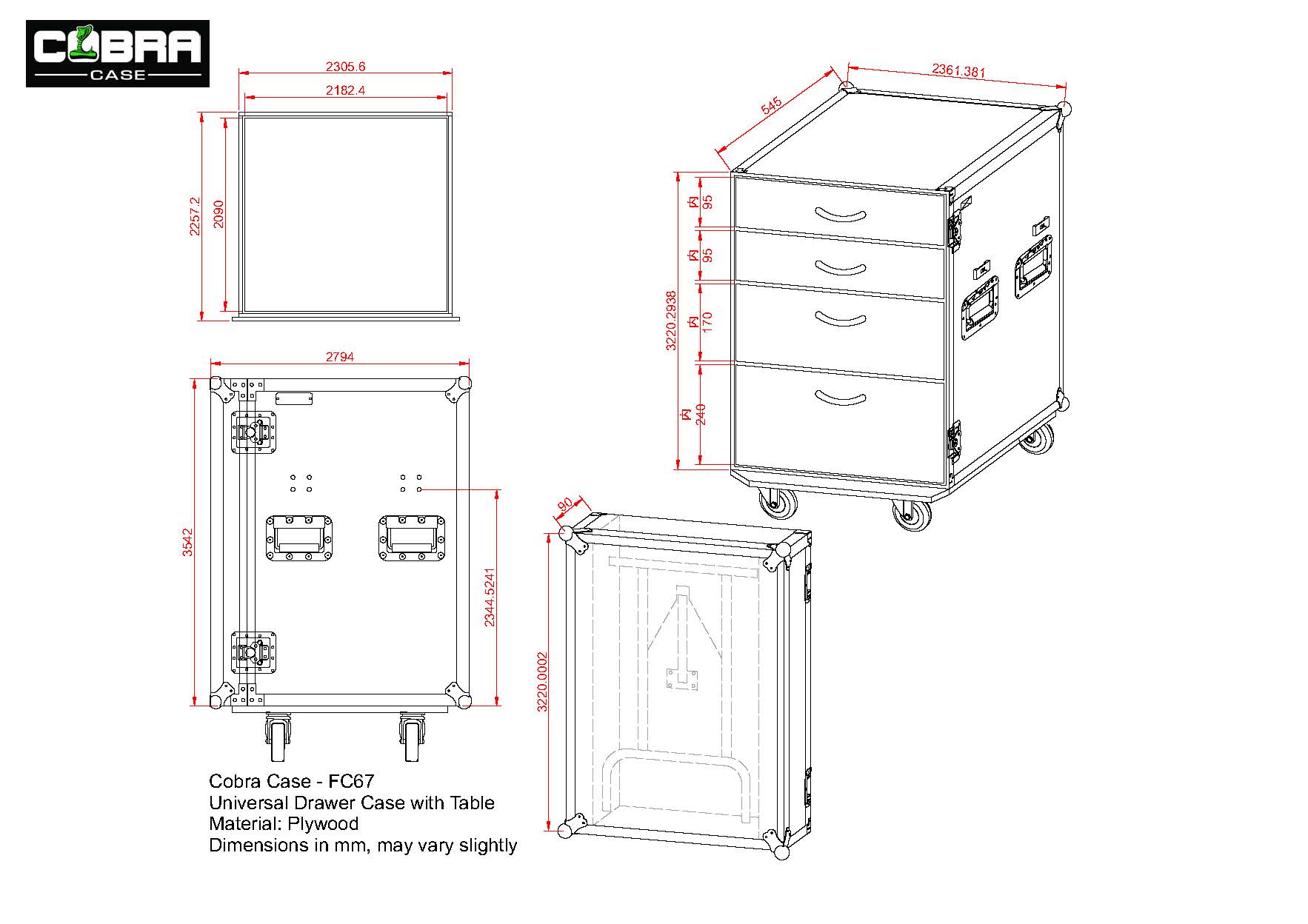 A secure, practical flight case for mobile or fixed use. The case has four substantial drawers and the front can be removed on the side to make a table. The case is made from thick hardwood and will withstand the stress of normal mobile shows or theatre storage. Features: Chromed corners and handles, 4 Butterfly catches, 4 Folding Handles, 1 Table front, 4 draws, 4 Wheels (2 Lockable).