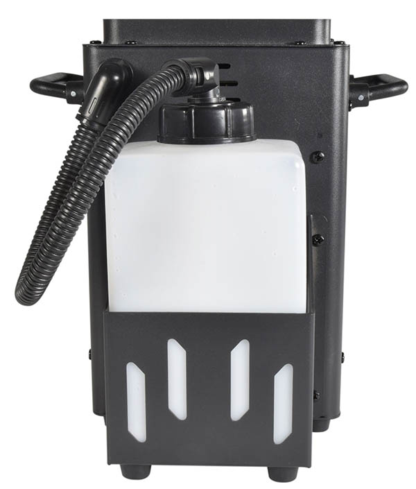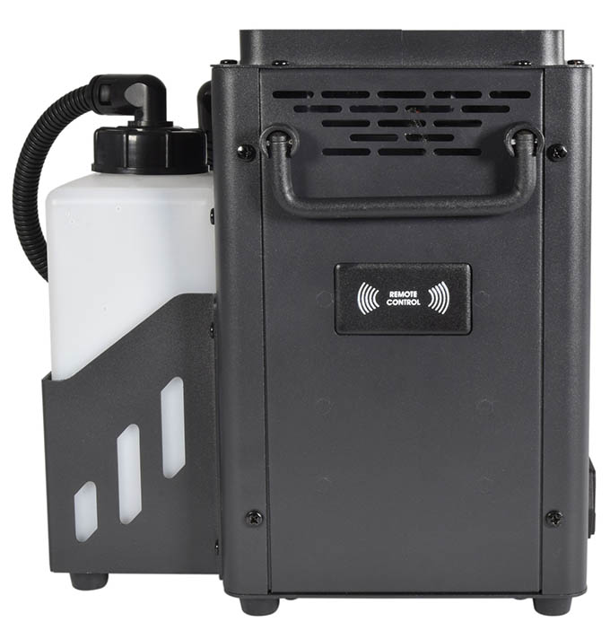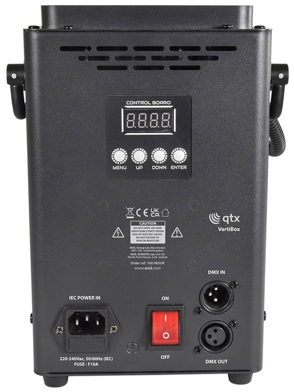 Small yet mighty, the QTX VertiBox delivers an impressive jet of vertical smoke that belies its compact box-sized appearance. The vertical smoke effect can be highlighted with an array of colours from the 12 bright LEDs housed in the top of the unit if desired. The smoke and light effects are easily controlled using either the control panel on the unit, the included key fob-style RF wireless remote or by 8-channel DMX connection. The 1.2 litre fluid bottle can be removed for easy refilling and the side folding carry handles provide an easy way to transport the unit from one event to the next.