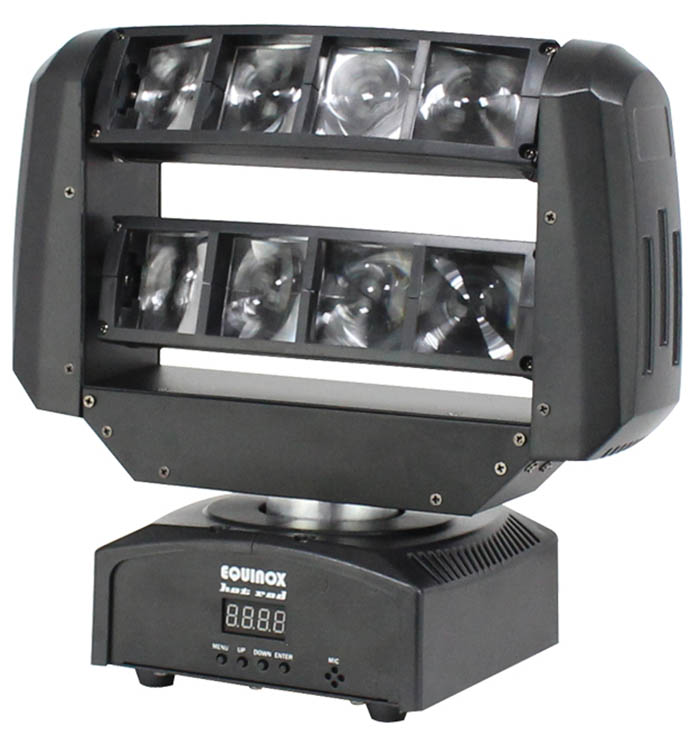 Fast moving 3.4° beams are projected from the twin, individually controllable, tilting bars which create dynamic atmospheric effects. Smooth, fast motors for pan and independent tilt movements allow the fixture to generate stunning mid-air effects from its 8 zones which are ideal for mobile DJs and clubs. On-board modes include: DMX, stand alone, sound active and master/slave. The hanging bracket allows the fixture to be installed in clubs, and also allows DJs to easily attach it to stands and trussing.