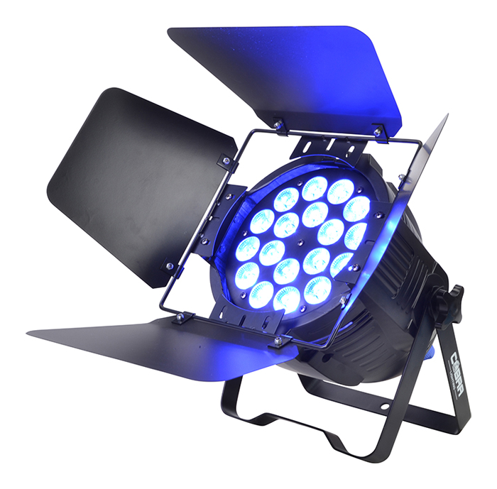 An extremely powerful LED Par Can housed in a tough metal case complete with barn doors. The eighteen 12 watt HEX LEDs should provide enough output for even the most demanding applications, giving the user almost unlimited colour options; With red, green, blue, amber, white and UV LEDs all included. With smooth colour mixing, virtually no heat output and only 150 watt power consumption, this light is suitable for many applications from theatres to clubs and bars.