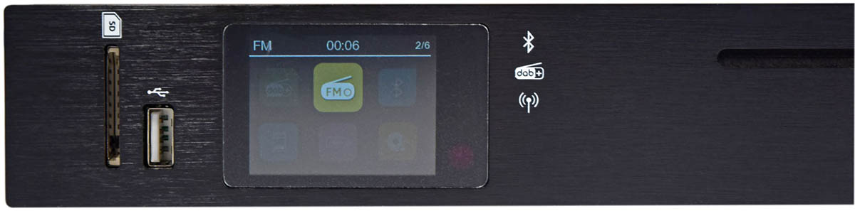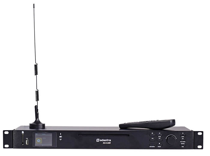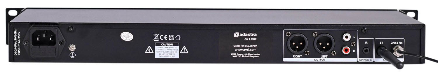 1U rack-mountable audio source with 6 different playback modes all in a single, compact unit. The clean and minimalist front panel is home to a full colour TFT display, which shows mode and settings information (including a clock in standby mode). Controls on the right side of the front panel operate the menus and playback, along with the included remote control handset. Modes include a slot-feed CD player, USB player, SD card player, FM tuner, DAB/DAB+ tuner and Bluetooth® receiver. A compact magnetic spring antenna is provided for FM and DAB+ reception which connects to an F socket on the AS-6 rear panel, or alternatively connect this socket to a roof mounted aerial for best possible reception. This mkII model has Left + Right outputs on both unbalanced RCA and balanced XLR connectors. A comprehensive solution for playback in any sound system installation requiring background music and other continuous program material.
