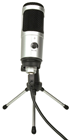 Mini studio condenser microphone for podcasting and vocal recording. Fitted with a back-electret capsule, driven by an onboard preamp with front-mounted volume control. Connection to a PC or Mac computer is via the supplied USB lead and operates as a plug & play USB audio device. The complete assembly is housed in a silver coated die-cast body with a black steel grille for the capsule. Supplied with a collar clamp and mini tripod for convenient, table-top operation.