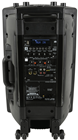 Complete portable PA unit in with a built-in amplifier operating from mains or internal rechargeable battery powering a main driver and compression driven horn unit. 2 x UHF handheld wireless microphones are included with the receiver built into the rear panel along with 2 further mic inputs, auxiliary line input and Bluetooth receiver. Internal audio source is provided by an integral USB/SD/FM media player. A moulded handle and pole mount are included and a retractable trolley handle and rear wheels provide easy portability.