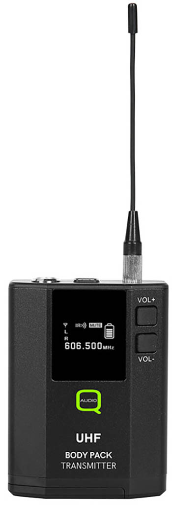 UHF Bodypack Transmitter for the Q-Audio QWM1970 radio mic systems. The bodypack is supplied with lavalier mic, headset mic and instrument cable. Available in license free or licensed bands.