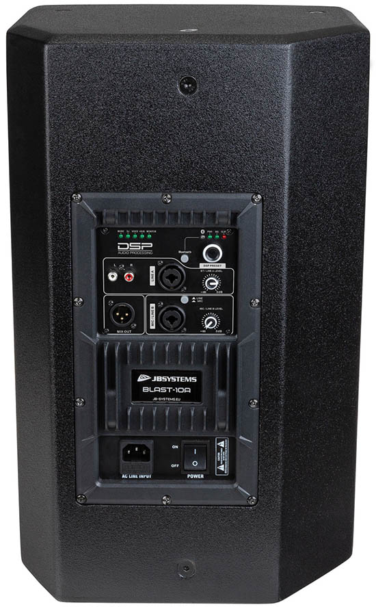The JB System Blast10 is a high-quality active speaker designed for pole mount or stage monitor use. Made from durable plywood with a sleek polyurethane finish, it delivers crystal-clear audio reproduction through a 250?Wrms amplifier, a 10" woofer, and a 1.35" titanium driver. Its dynamic sub EQ provides surprisingly deep bass, while the integrated DSP processor offers several presets for different applications, including stand-alone front-of-house, DJ, speech, stage monitor, and high-pass mode for use with subwoofers. The Blast10 features two mixable audio inputs: Input A with level control supports a balanced jack/XLR (+RCA) line input and Bluetooth receiver input, while Input B with level control supports a balanced jack/XLR (+RCA) line input and a balanced jack/XLR microphone input. The link output carries the mixed signal from both inputs. An optional touring bag is also available for safe transport, making the JB System Blast10 a versatile choice for DJs, performers, and live events.
